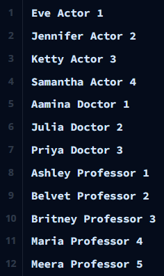 Pivot the Occupation column in OCCUPATIONS so that each Name is sorted alphabetically and displayed underneath its corresponding Occupation. The output column headers should be Doctor, Professor, Singer, and Actor, respectively.